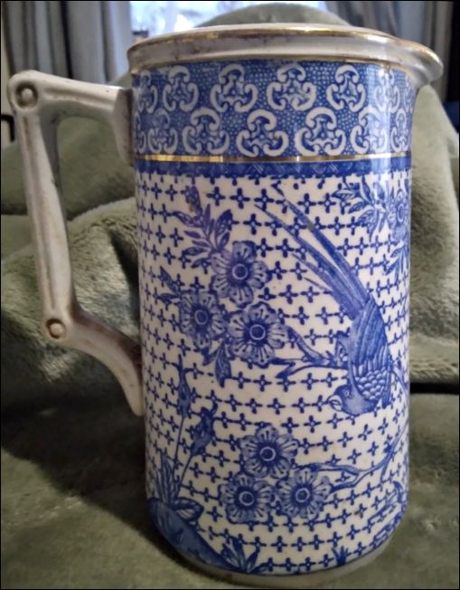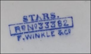 |  transferware jug in an aesthetic style pattern - it is described as "stylised flowering shrubs with parrots perched in the branches over a star ground, borders of bands of daisy heads" (Northern Ceramic Society) |  F Winkle & Co "STARS" is the pattern name the registration number 33382 shows that the pattern was originally registered on the 16th September 1885 to Winkle & Wood at the Pearl Pottery, Brook Street, Hanley |