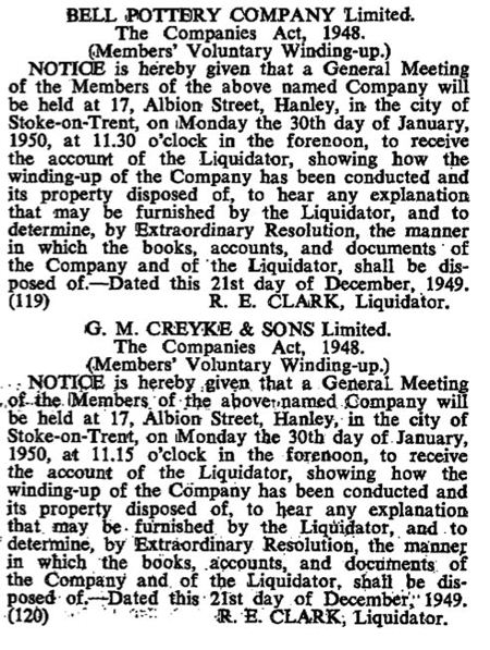 The Bell Pottery Company and G. M. Creyke were voluntarily liquidated in 1947