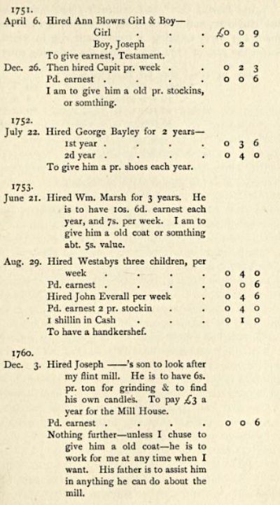 Hired Joseph - 's son to look after my flint mill. He is to have 6s. pr. ton for grinding & to find his own candles. To pay £3 a year for the Mill House.