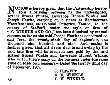 NOTICE is hereby given, that the Partnership heretofore subsisting between us the undersigned, Arthur Ernest Winkle, Lawrence Hubert Winkle and Joseph Hewitt, carrying on business as Earthenware Manufacturers, at Colonial Potteries, Fenton, in the county of Stafford, under the style or firm of “F. WINKLE AND CO.,” has been dissolved by mutual consent as far as the said Joseph Hewitt is concerned as and from the twenty-ninth day of September, one thousand nine hundred and nine. And notice is further given, that all debts due to and owing by the said late firm will be received and paid by the said Arthur Ernest Winkle and Lawrence Hubert Winkle, who will in future carry on the business under the same style on their own account.—Dated the twenty-third day of December, 1909.
