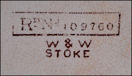 ![]() W & W STOKE The registration number 109760 shows that the pattern was registered on the 3rd October 1888 to Winkle & Wood at the Pearl Pottery, Hanley. The 'W & W STOKE' shows that the mug was actually made by Winkle & Wood at the Colonial Pottery in Stoke sometime between 1888 and Sept 1889 |