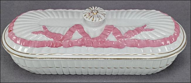 "Five pieces all with vertically fluted moulding and a bow and ribbon border comprising a jug, sucrier and cover, tea cup, bowl, covered dish and ?preserve pot on stand" description courtesy: David Beaton, Northern Ceramic Society |