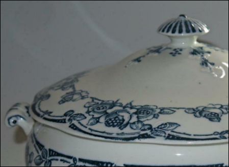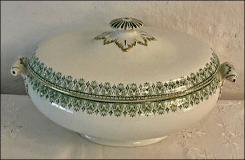 these two lidded serving dishes have different patterns using the same design body & lid - the body has distinctive scroll handles, the lid has the same finial surrounded by a moulded surround. The design was originally produced by the preceding company Powell, Bishop & Stonier |