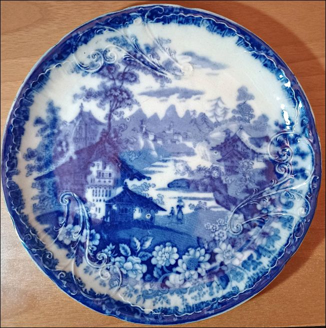 ![]() Blue & White plate in the Caronia pattern with scroll moulded rim