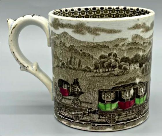 transfer printed in brown with hand-coloured red and green blocks of colour The steam train, named Nero, is shown pulling two first class carriages and a wagon truck carrying a horse drawn carriage through an English rural landscape. |