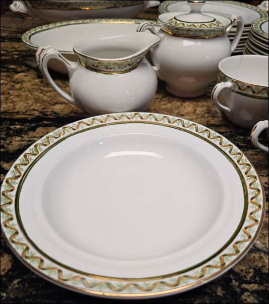 An Edwardian era design in a transfer pattern - the border features a repeating undulating ribbon design in gold colour with shading. Within the ribbon are small green foliage sprigs and the rim has a gilt band.  |