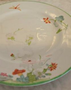 “Shola China” is a trade name used by Wood & Son(s) - it refers to the semi-porcelain body used for their finer tableware lines, and is not a pattern name. All known examples of Shola China are dinner ware, usually predominantly white/cream with minimal floral and geometric borders. Sometimes the pattern name is included in the mark. photos courtesy: Lori Linda  |