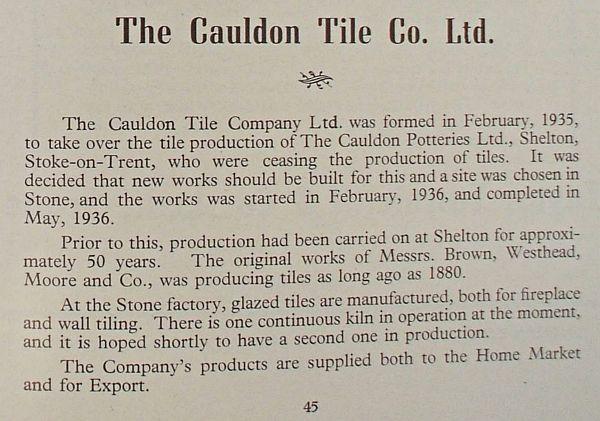 THE CAULDON TILE CO. LTD. was formed in 1935 to take over the tile-making section of the Cauldon Potteries Ltd. Tiles had first been produced at Cauldon Place, Stoke-on-Trent, during the latter half of the last century by Brown-Westhead, Moore & Co., who later became the Cauldon Potteries Ltd. The tradition behind Cauldon Pottery has been carried on by the Cauldon Tile Co. Ltd. as far as tiles are concerned at the new works this company constructed in Stone in 1936. Here a modern factory was put down in a rural setting, together with the most up-to-date machinery and kilns. The outbreak of war in 1939 brought to a stop the progress made, and the works was turned over to the production of electrical components for the War effort. In 1946 the original Directorate and staff once more set about the task of building up the firm's reputation. All were imbued with the sole idea of improved quality and more production. The firm is not content to rest on its laurels, but is constantly pursuing new ways and means to consolidate and increase its already striking achievements, A policy of progressive development is the keynote of the whole concern, allied with a determination to make a full contribution to the country's economy.