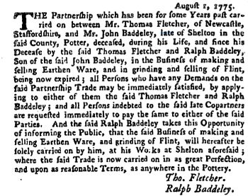 August 1, 1775. THE Partnership which has been for some Years past carried on between Mr. Thomas Fletcher, of Newcastle, Staffordshire, and Mr. John Baddeley, late of Shelton in the said County, Potter, deceased, during his Life, and since his Decease by the said Thomas Fletcher and Ralph Baddeley, Son of the said John Baddeley, in the Business of making and selling Earthen Ware, and in grinding and selling of Flint, being now expired; all Persons who have any Demands on the said Partnership Trade may be immediately satisfied, by applying to either of them the said Thomas Fletcher and Ralph Baddeley; and all Persons indebted to the said late Copartners are requested immediately to pay the same to either of the said Parties. And the said Ralph Baddeley takes this Opportunity of informing the Public, that the said Business of making and selling Earthen Ware, and grinding of Flint, will hereafter be solely carried on by him, at his Works at Shelton aforesaid; where the said Trade is now carried on in as great Perfection, and upon as reasonable Terms, as anywhere in the Pottery. Tho. Fletcher. |