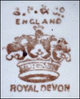 In March 1907 an advert in the Pottery Gazette reads... '"Royal Devon' Ware is stamped on every piece with the annexed Trade Mark" The mark shows a coronet crown, as opposed to the Imperial Crown previously used. It appears that Royal Devon was only used until around 1913 when the trade name Crown Devon was introduced. |