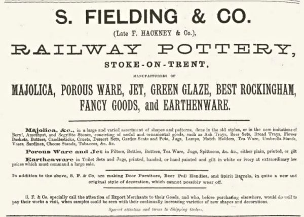Railway Pottery Established by S. Fielding & Co. in Sutherland Street in 1870 for the manufacture of majolica, terra-cotta, jet, Rockingham, green- glaze goods and general earthenware, in all of which the usual useful, ornamental, and fancy articles were made. This firm introduced in the early 1880s a new feature in majolica goods, which they named 'Majolica argenta', in which they produced a vast variety of articles of a remarkably taking, pleasing and useful character. This, as its name implied, consisted of a white body and glaze with the proper majolica colouring liberally and judiciously used either on the body or on the embossed decorations. The effect was extremely pleasing.