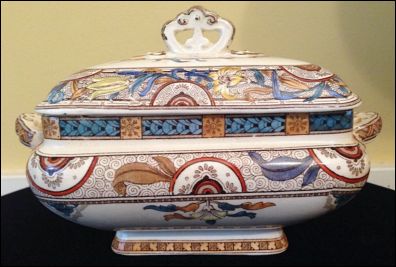 ![]() lidded tureen and base, blue transfer ware with gilding in the Japan pattern |