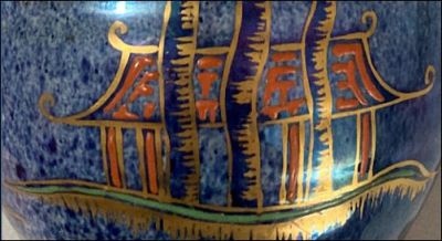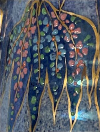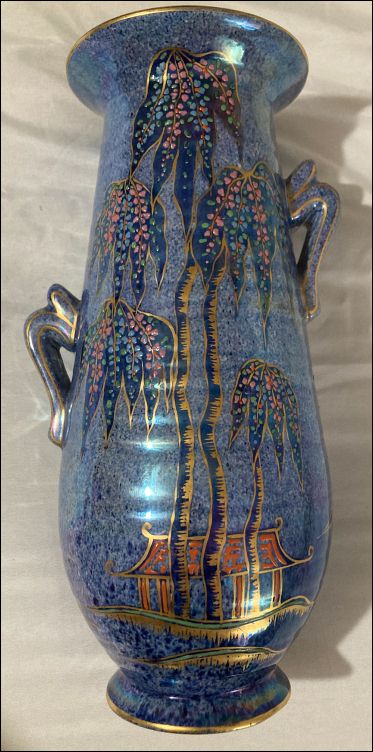 This Bewley vase features a striking blue lustre glaze with hand-painted gilt and coloured enamel decoration. The pattern depicts stylised trees with drooping branches and a small pavilion at the base. The trees are outlined in gold, the leaves containing clusters of raised, colourful dots in pinks, greens and blues. |