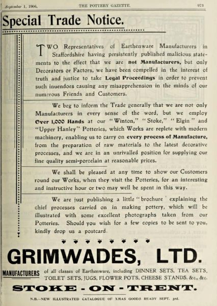 TWO Representatives of Earthenware Manufacturers in Staffordshire having persistently published malicious statements to the effect that we are not Manufacturers, but only Decorators or Factors, we have been compelled in the interest of truth and justice to take Legal Proceedings in order to prevent such inuendoes (sic) causing any misapprehension in the minds of our numerous Friends and Customers. We beg to inform the Trade generally that we are not only Manufacturers in every sense of the word, but we employ over 1,000 Hands at our “Winton,” “Stoke,” “Elgin” and “Upper Hanley” Potteries, which Works are replete with modern machinery, enabling us to carry on every process of Manufacture, from the preparation of raw materials to the latest decorative processes, and we are in an unrivalled position for supplying our fine quality semi-porcelain at reasonable prices. We shall be pleased at any time to show our Customers round our Works, when they visit the Potteries, for an interesting and instructive hour or two may well be spent in this way. We are just publishing a little “ brochure ’ explaining the chief processes carried on in making pottery, which will be illustrated with some excellent photographs taken from our Potteries. Should you wish for a few copies to be sent to you, kindly drop us a postcard. Grimwades,