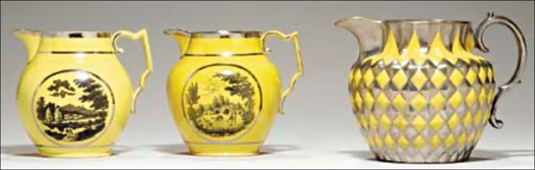 'Harlequin' jug with scroll handle, fluted neck and pineapple-moulded body, decorated with alternate yellow and silver lozenges; together with two yellow-ground jugs, each printed with figures in a park before a manor, with silver luster bands. The two small jugs are identical form and handle shape as the pineapple jug from the National Trust Collection.
