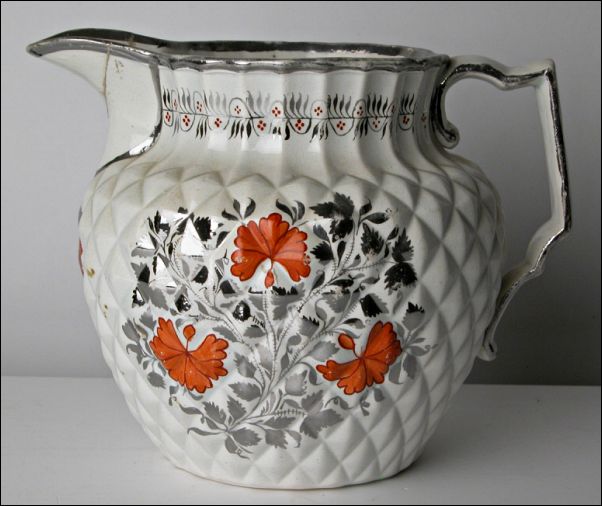 "Earthenware jug shaped as a pineapple, with silver lustre and orange floral/foliage motifs and silver lustre edging to rim, handle and lip. Foliage border in silver with dark red dots around neck. Main body has hints of very pale blue glaze. Probably Thomas Harley, Lane End (Longton, Staffordshire)" |