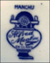 this mark on a white ironstone toothbrush holder dates from the first years of the operation of Alfred Meakin and so is c.1873. It is derived from the former C & A Meakin mark and the 'C' has been removed from the stamp - this will have been as a stop-gap measure until new Alfred Meakin stamps were made. photo courtesy: Cadence Drink |