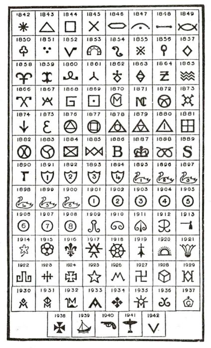 This year mark table is reproduced from the Encyclopaedia of British Pottery and Porcelain Marks by Geoffrey Godden, p.440 |
