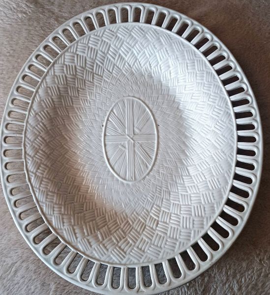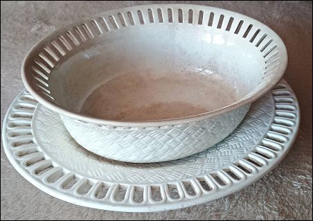 ![]() Cream-ware basket-weave design The intricate 'pierced' or openwork edges on both the bowl and plate were a signature technique of the period. Basket-weave Pattern: The exterior of the bowl and the center of the plate are embossed with a woven texture to mimic a real basket. Cream-ware was a refined earthenware developed in the mid-18th century as a more affordable, lightweight alternative to expensive Chinese porcelain. |