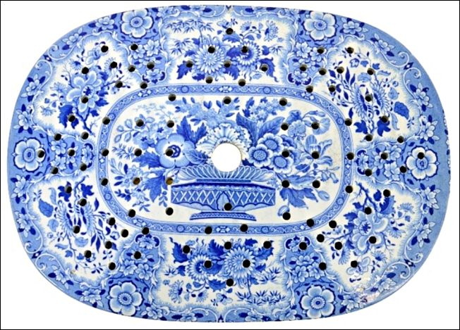 ![]() Staffordshire blue and white 'Semi Nankeen China' strainer tray transfer-printed in underglaze blue with a central basket of flowers framed in a narrow band of flowers and leaves. The remaining area occupied by a wide border divided into six panels with sprays of flowers, the intervening areas decorated with flowers against a stippled ground. |
