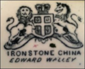 Examples of typical ware: Walley, Edward. Villa Pottery. "The major product at this pottery appears to have been moulded jugs although ironstone china with printed decoration was also made. A variety of printed and impressed marks were used with the surname in full and either the letter E or the full Christian name. The printed initial W has also been attributed to this potter" 'The Dictionary of Blue & White Printed Pottery 1780-1880' Coysh & Henrywood