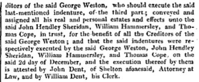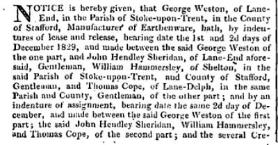 NOTICE is hereby given, that George Weston, of Lane-End, in the Parish of Stoke-upon-Trent, in the County of Stafford, Manufacturer of Earthenware, hath, by indentures of lease and release, bearing date the 1st and 2d days of December 1829, and made between the said George Weston of the one part, and John Hendley Sheridan, of Lane-End aforesaid, Gentleman, William Hammersley, of Shelton, in the said Parish of Stoke-upon-Trent, and County of Stafford, Gentleman, and Thomas Cope, of Lane-Delph, in the same Parish and County, Gentleman, of the other part; and by an indenture of assignment, bearing dale the same 2d day of December, and made between the said George Weston of the first part; the said John Hendley Sheridan, William Hammersley, and Thomas Cope, of the second part ; and the several Creditors of the said George Weston, who should execute the said last-mentioned indenture, of the third part ; conveyed and assigned all his real and personal estates and effects unto the said John Hendley Sheridan, William Hammersley, and Thomas Cope, in trust, for the benefit of all the Creditors of the said George Weston ; and that the said indentures were respectively executed by the said George Weston, John Hendley Sheridan, William Hammersley, and Thomas Cope, on the said 2d day of December, and the execution thereof by them is attested by John Dent, of Shelton aforesaid, Attorney at Law, and by William Dent, his Clerk. |