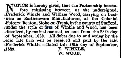 |  1888 Winkle and Wood Colonial Pottery | The London Gazette 15 October 1889
