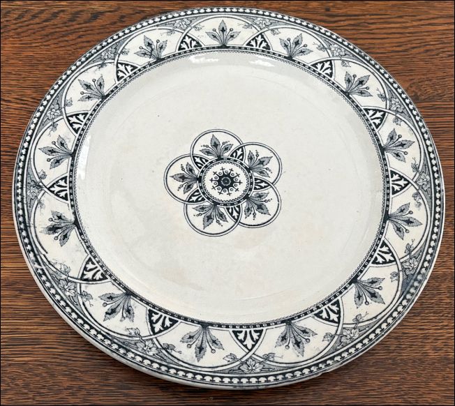 ![]() transferware plate in the Thames pattern The design blends geometric order with naturalistic ornament, very characteristic of transferware influenced by the Aesthetic Movement — restrained, balanced, and slightly architectural rather than heavily floral. |