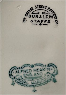 ![]() THE BRIDGE STREET POTTERY Co BURSLEM STAFFS Alfred Meakin these marks clearly show that the manufacturer of the white ware blanks was Alfred Meakin |