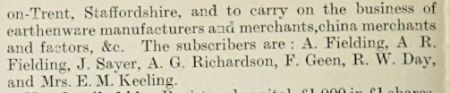 merchants and factors, &c. The subscribers are: A. Fielding, A. R. Fielding, J. Sayer, A. G. Richardson, F. Green, R. W. Day, and Mrs. E. M. Keeling. |