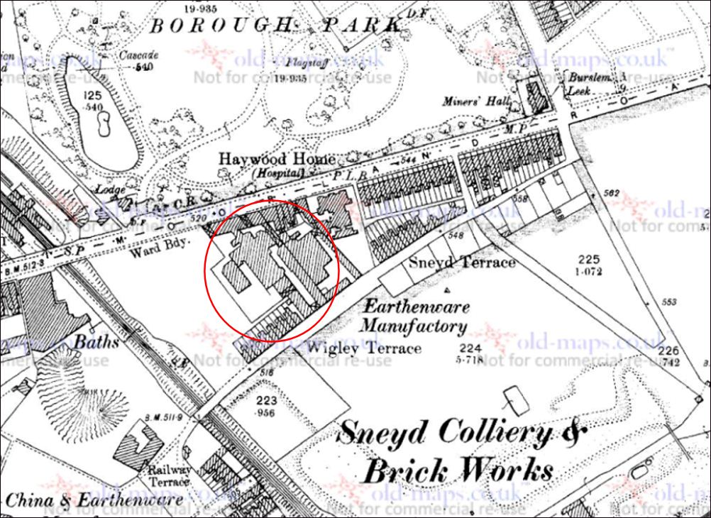 The Albany and Harvey Potteries and environs, Burslem, 1951. This image has been produced from a print marked (by the white lines) by Aerofilms Ltd for photo editing. In the bottom left is the tip of the aircraft wing. In the forground (green rectangle) is the edge of Burslem Park which was opened in 1894. Between the park and the pottery works is Moorland Road. The light blue circle is the Haywood Home hospital which was built in 1887, it is still standing today (2021). The Albany (red) and Harvey (blue) Potteries are no longer standing (although some sections of walls may still exist) - industrial units now occupy this land. In the background is the Sneyd Colliery & Brick Works. |