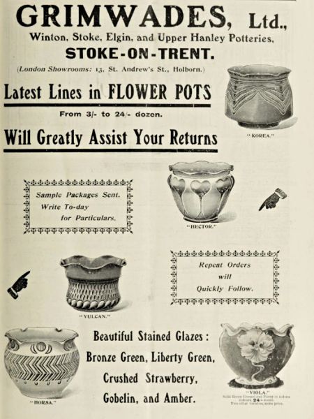 ![]() Grimwades, Ltd., Winton, Stoke, Elgin and Upper Hanley Potteries Stoke-on-Trent Latest Lines in Flower Pots The Pottery Gazette 1st June 1906 |