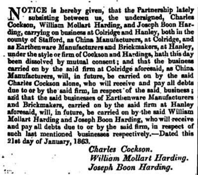 Charles Cockson continued at the Cobridge China works and William & Joseph Harding continued earthenware and brick manufacture at the Newhall Works. "NOTICE is hereby given, that the Partnership lately subsisting between us, the undersigned, Charles Cockson, William Mollart Harding, and Joseph Boon Harding, carrying on business at Colridge and Hanley, both in the county of Stafford, as China Manufacturers, at Colridge (sic), and as Earthenware Manufacturers and Brickmakers, at Hanley, under the style or firm of Cockson and Hardings, hath this day been dissolved by mutual consent; and that the business carried on by the said firm at Colridge aforesaid, as China Manufacturers, will, in future, be carried on by the said Charles Cockson alone, who will receive and pay all debts due to or by the said firm, in respect of the said business; and that the said businesses of Earthenware Manufacturers and Brickmakers, carried on by the said firm at Hanley aforesaid, will, in future, be carried on by the said William Mollart Harding and Joseph Boon Harding, who will receive and pay all debts due to or by the said firm, in respect of such last mentioned businesses respectively.—Dated this 21st day of January, 1863."