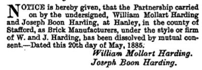 "NOTICE is hereby given, that the Partnership carried on by the undersigned, William Mollart Harding and Joseph Boon Harding, at Hanley, in the county of Stafford, as Brick Manufacturers, under the style or firm of W. and J. Harding, has been dissolved by mutual consent.—Dated this 20th day of May, 1885."