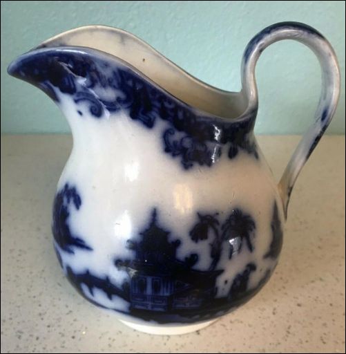 ![]() earthenware jug with flow blue pattern |