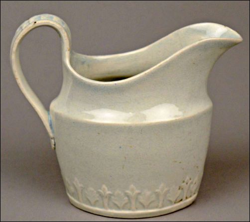 "Milk-jug; earthenware; with glaze of pale bluish-green tint; pointed oval section; handle with leaf moulding; band of raised ornament round the lower part of body; stamped with maker's mark." |