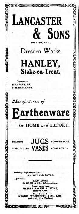 Page created 2 Jan 2011 Updated 29 Nov 2017: Marks and ware examples added. Updated 27 Dec 2020: Added - Examples of Willow ware; Medici lions. Updated 7 Apr 2025: Details of wartime activity added. Updated 8 Sept 2025: Added - Royall & Lanson ware; Ogden Tobacco Card; link to Tinkersclough; 1921 advert. |