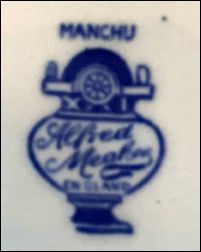 this mark on a white ironstone toothbrush holder dates from the first years of the operation of Alfred Meakin and so is c.1873. It is derived from the former C & A Meakin mark and the 'C' has been removed from the stamp - this will have been as a stop-gap measure until new Alfred Meakin stamps were made. photo courtesy: Cadence Drink |