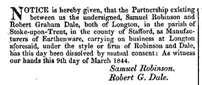 | Robinson & Dale | Longton | at least by 1841 | March 1844 |