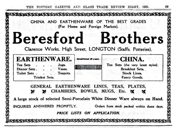 Page created 17 February 2018 Updated 8 Nov 2014: Page updated - 1907 directory details added. Updated: 25 Jul 2021: Link to Clarence Works added Updated: 5 Sep 2025: Introduction section expanded and references to other uses of 'Clarence' added; examples of crested ware added; example of New Hall ware added; 1921 adverts added. |