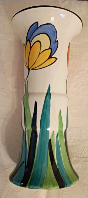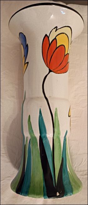 These vases feature a hand-painted floral motif in blue and yellow and contrasting red and yellow, with green foliage and dark accents at the base. The pattern is stylised / 'Art Deco' in its interpretation of natural form and is characteristic of some English pottery designs from the early 20th century. |
