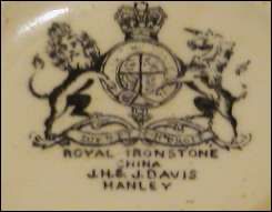 However in the late 19th and early 20th century many potters who did not have a Warrant (both in England and also foreign firms) also used the Arms (or some similar design) as part of their mark - to gain some sense of importance and value.In the same way many potters used the name "Royal" as part of their name or trade mark as in 'Royal Patent', 'Royal Ironstone China' - even though they have no Royal connection.