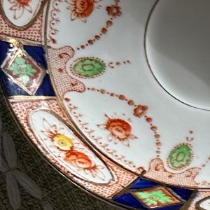 ![]() Josiah Spode Date: 1790-1820 A deep saucer decorated in the ‘Imari’ style and colour palette of cobalt blue, iron red and gold. |