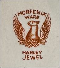 The Jewel pattern was introduced by Joseph Clementson (1839-64) and incorporates the Phoenix mark which was used on other ware in conjunction with the Clementson name. Little is documented about Morfenix Ware. The name is likely a creative form of “More + Phoenix” - effectively branding this ware as a superior or renewed phoenix line. In 1857 the townships of Hanley and Shelton were incorporated to constitute the municipal borough of Hanley. Morfenix Ware has the town name HANLEY and so is likely to have been produced post 1857.