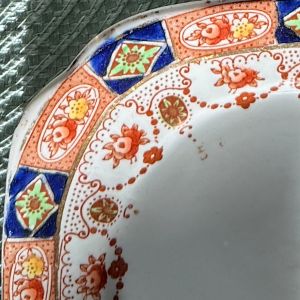 While many English pottery continued to produce quality, well decorated Imari-style ware the demand for low-cost ware resulted in decoration which was quickly executed. This example by Charles Hobson & Son is crudely decorated with heavy and imprecisely painted blue and orange areas and thick, varying gold lines. Over time, the term “Imari” came to mean any densely decorated, gilded porcelain featuring Oriental style motifs in vivid shades of gold, green, red, and underglaze blue. |