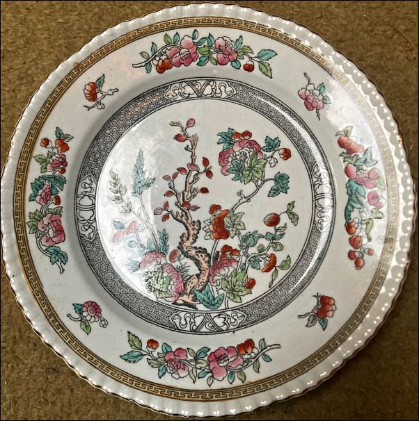 ![]() plate in the Dresden pattern- based on the popular Indian Tree pattern this pattern was started by Pinder, Bourne & Hope and continued by Doulton & Co |